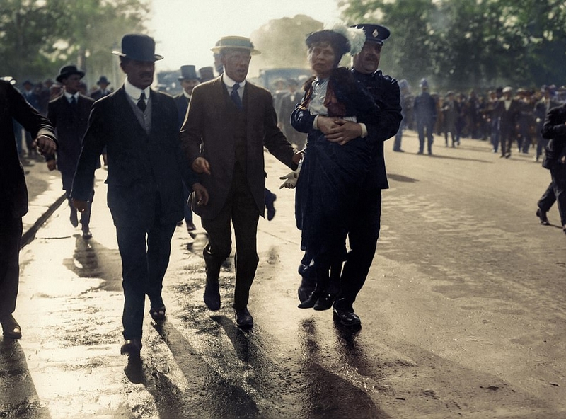这本书中的图片显示,潘克赫斯特(Panchurst)夫人由于试图直接向乔治五世递交请愿书,为女性争取投票权,被大都会警察总监罗尔夫(Rolfe)双手提起。她在王宫门口被捕,并被送到了霍洛威监狱。两个月后,随着第一次世界大战爆发,这场运动被放弃,以支持战争。妇女从1918年开始获得投票权。潘克赫斯特夫人活着看到了这些,但是在照片拍摄两周后,罗尔夫就死了。