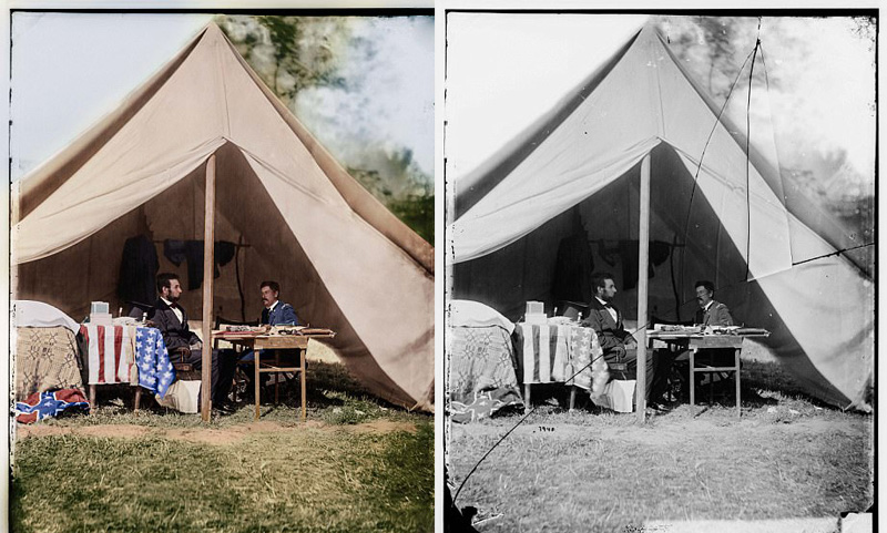 马里奥还原的老照片都拍摄于19世纪中末期和20世纪初期,有的甚至超过了150年之久。这些照片中,有的恰好记录下了美国历史上具有重要意义的时刻,如美国内战时期,总统林肯与联邦军将领乔治•布林顿•麦克莱伦(George B McClellan)在帐篷内会面;有的拍摄下了宾夕法尼亚骑兵团中的军官们。