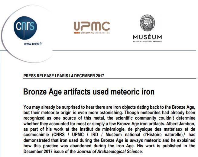 新发现:竟有使用陨铁打造的青铜时代文物环球网 2017-12-06 |
