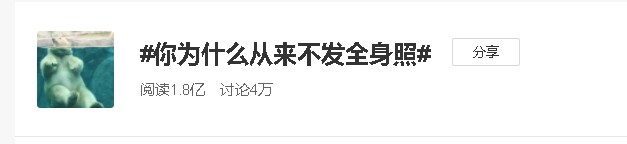 最近,微博上 #你为什么从来不发全身照# 话题引热议,内中原因多样,拍照不上相、真的不好看、PS工作量太大、上传之后担心被吐槽等。