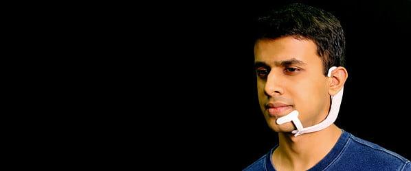 这可不是忽悠,其实这是由麻省理工学院的研究人员发明的一款特殊耳机,它的名字叫AlterEgo,它由环绕用户耳朵的部分、贴附在下巴的部分以及一个内置的计算机系统组成。