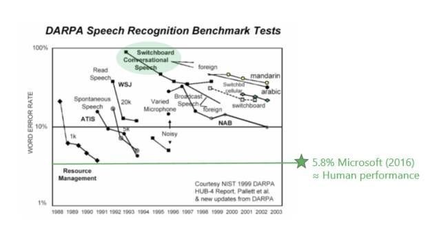 作为语音识别领域的领军人物,微软于2016年也仅仅将错误率控制在5.8%左右。可是随着人工智能进一步拓展到金融、医疗等领域,1%的错误率导致的可能是财产的损失和生命的安全。