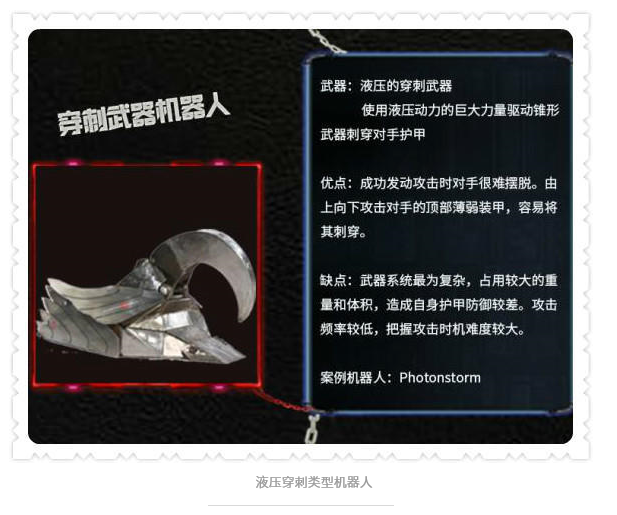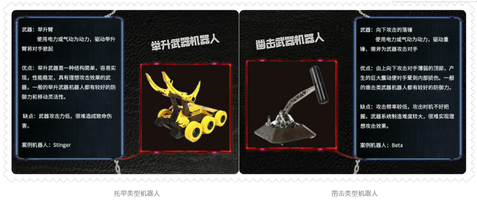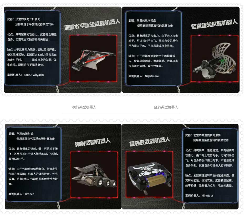 看了这么多,是不是想拥有一架最厉害的铁甲,所向披靡!然而,就像自然界的生物相生相克,各具特点的格斗机器人也各有“铠甲”和“软肋”,简单来说,一些举升、凿击类型的机器人前铲较低,防御性更好,比较克制水平旋转型格斗机器人;而水平旋转型机器人攻击凶猛,又比较克制防御较弱的竖直旋转型机器人;但是,竖直旋转型机器人敏捷性更好:“那些贴地性差的防御型机器人根本不是我的对手!”