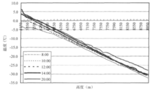 为正确解决测定珠峰高程中的大气垂直折光问题,2005年5月22日在离峰顶约18km处的珠峰大本营(海拔高度约5100m)分别在8:00、10:00、12:00、14:00、20:00五个时间段释放探空气球进行了无线电高空探候,测定了相应的大气气象数据。