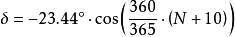 由于地球公转轨道的偏心率非常低,可以看作是一个圆圈,太阳赤纬可用下面两个公式来计算: