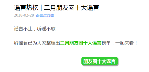 日前,微信官方公众号“谣言过滤器”对外公布了2018年2月份朋友圈十大谣言,包括白酒加水不浊是假酒、八宝粥是海绵做的、粉丝是塑料做的以及甘南地区现“漂浮汽车”等。