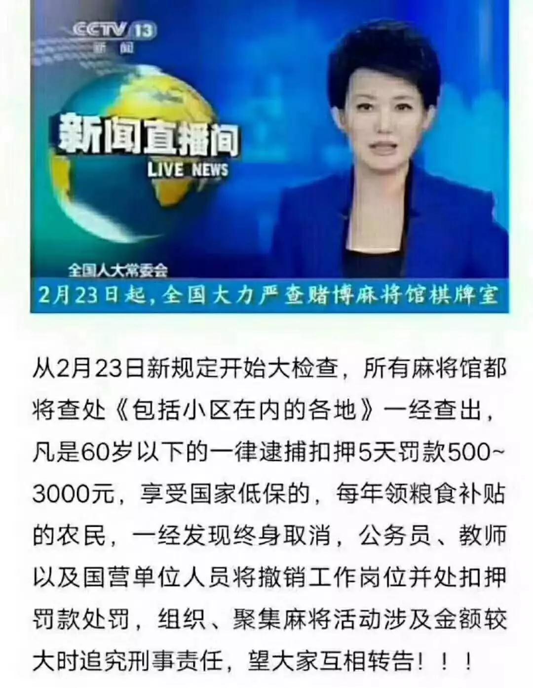 从2月23日新规定开始大检查,所有麻将馆都将查处《包括小区在内的各地》一经查出,凡是60岁以下的一律逮捕扣押5天罚款500~3000元,享受国家低保的,每年领粮食补贴的农民,一经发现终身取消,公务员、教师以及国营单位人员将撤销工作岗位并处扣押罚款处罚,组织、聚集麻将活动涉及金额较大时追究刑事责任,望大家互相转告!!!