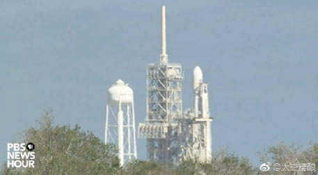 猎鹰重型火箭发射场直播视频截图:晴,万里无云。但此时SpaceX刚刚宣布高空风太大,延后两小时发射 PBSnewshour