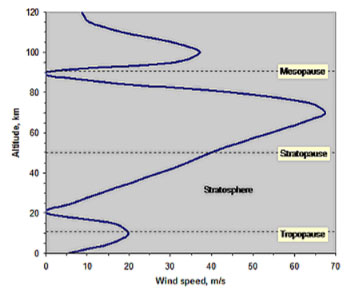 国际空间研究委员会(COSPAR)公布的大气模型中关于平均风速的描述,可以看到对流层的风速比起高空大气只是小巫见大巫 来源:COSPAR