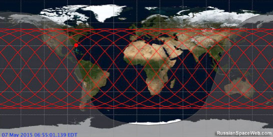 以国际空间站的货运飞船进步号为例的地面轨迹图,可以明显看到要飞行很多圈之后才会重复路过某地/发射场上空 来源:RussianSpaceWeb.com