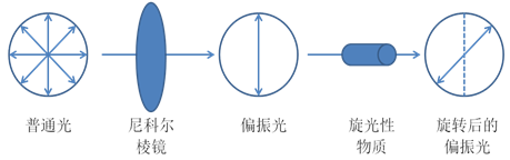 光作为一种电磁波,其振动方向与光的前进方向垂直,而且在各个不同方向均有振动。让普通光通过一个尼克尔(Nicol)棱镜,则通过棱镜的光就只能在一个方向上振动,这种光就叫做偏振光。当偏振光通过某种介质时,如果介质能使其振动方向发生旋转,则这种物质被称为旋光性物质。而这种能旋转偏振光的振动方向的性质被称作旋光性。