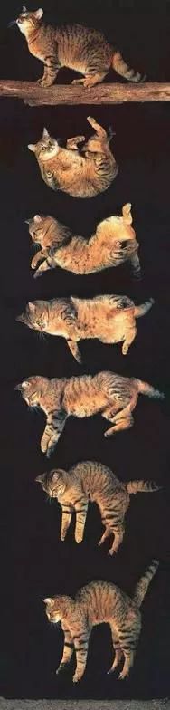 他认为是高度升高后,猫会有更多的时间去调整姿态,如果猫可以完成四肢伸展的动作,则基本不会有事,因为猫的四爪伸展后会立刻达到极限坠速,且当猫的四爪着陆后,会将能量吸收并利用尾巴做出一个漂亮的侧滚动作。