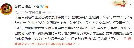 【真相】1月17日,上海警方发布通报称,该帖文内容纯属谣言,编造该谣言的犯罪嫌疑人江某已被依法刑事拘留。经查,33岁的上海网民江某于1月8日在一个四百余人的微信群里发布了关于“8岁小学生坐公交车被暴打受重伤”的信息,后该聊天记录被转发至篱笆网等网络论坛上。据江某交代,其出于在朋友圈内博人眼球、引发关注的目的,杜撰并编发了8岁小学生坐公交车被暴打受重伤的虚假信息,帖文内容纯属子虚乌有,江某对自己的违法行为供认不讳。