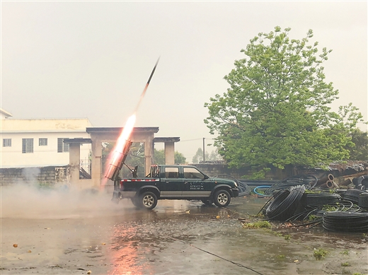 2018年3月18日,广西省桂平市气象局成功发射人工增雨火箭弹4枚,作业影响区域普降喜雨。(梁泽义、陈俊全/《广西日报》)