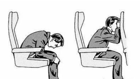 5、飞机迫降时,应双手交叉放在前排座位上,头部放在手上。也可以将身体蜷缩在一起,比如身体弯向膝盖,双手尽量抱住脚踝,这样可以有效防止巨大撞击力对骨骼的损伤。