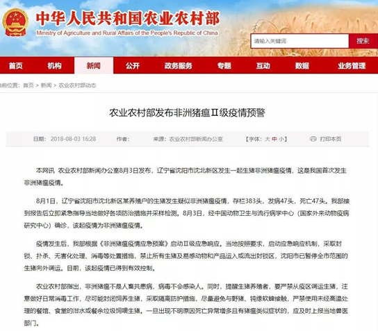 8月3日上午11时,辽宁省沈阳市沈北新区确认了我国首例非洲猪瘟疫情,当天下午,中华人民共和国农业农村部发布了非洲猪瘟的Ⅱ级疫情预警。