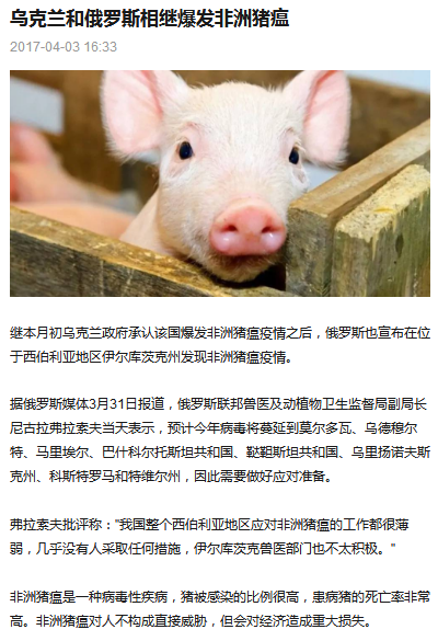 自2007年以来,非洲猪瘟在全球多个国家发生、扩散、流行,特别是俄罗斯及其周边地区。2017年3月,俄罗斯远东地区伊尔库茨克州发生非洲猪瘟疫情,疫情发生地距离我国仅为1000公里左右。因此,这次中国发现的非洲猪瘟,很可能是从周边临国传入的[3]。