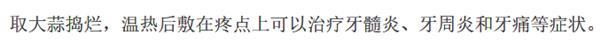 换句话说,出现牙齿疼痛的时候,牙齿已经被细菌严重破坏,此时再杀菌,“远水不解近渴”,大蒜没有办法吸收多余的渗出液,自然不能减少疼痛,反而有可能加重对牙神经的刺激,得不偿失。