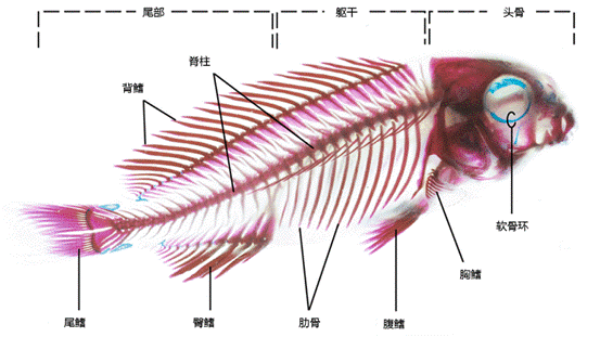 鲫鱼的骨骼由轴向骨骼(颅骨,脊柱,肋骨和内侧鳍)和附肢骨骼(胸鳍,骨盆带)组成。(图3)如下图所示: