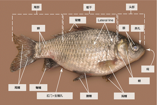 图 2 鲫鱼的外部解剖图(图片来源:Lőw P et al. , /Atlas of Animal Anatomy and Histology. Springer, Cham, 2016: 173-212.)