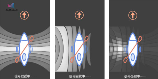 “接收扇面”与“发射扇面”相交方向“照射”到的海底就是被测区域,根据声波信号传播回来的方向与往返时间,可以计算出被测区域的水深和距离船体的水平位置。