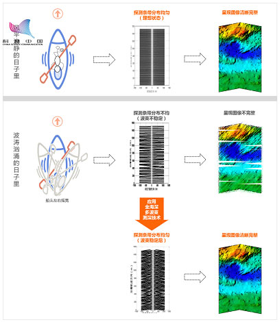 众所周知,大部分时间里海面不会风平浪静。海水中的声速约为1500米/秒,探测11000米海域时,全海深多波束一次测量过程(从开始发射声波到接收完最远端返回的声波)需要几十秒,在这段时间里船的姿态始终随着风浪变化,此时声波的发射方向和回波接收方向可能都不再是预设的方向,得到的水深结果就会存在误差,拼接起来的水深图可能会发生扭曲。