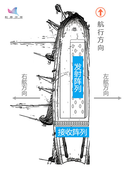 全海深多波束测深系统也是安装于船体,工作频率一般为12kHz,从外观上看是两条阵,第一条是发射阵,沿着船体龙骨方向安装,它发出的声波信号会形成一个“发射扇面”,“照射”到垂直船体龙骨方向的海底条带的各个位置。在“发射扇面”上,波束沿着龙骨方向张开的角度较小,为0.5至2度,当波束角度为1度时,发射阵的长度约为8米。