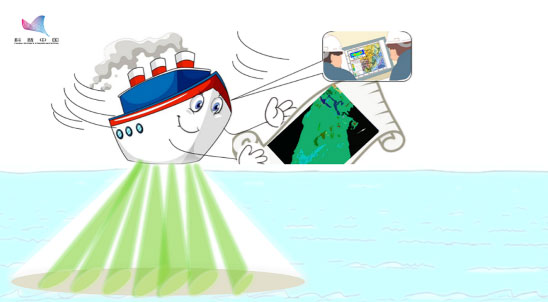 一开始,科学家们使用的是单波束测深仪,它安装在船底,工作时向船的正下方发射一束声波信号,声波到达海底反射回来再由单波束测深仪接收。结合声波在水中传播速度、发射到接收所用传播时间,就可以计算出海底深度。单波束测深仪可以快速有效地测量海洋深度,但一次测量只能获得一个位置的水深结果,效率还是比较低。
