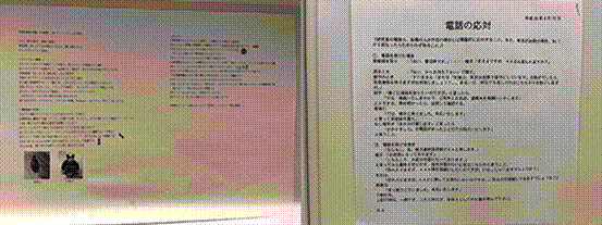 左图是本实验室一个制备样品的标准流程,任何修改企图都会遭到日本同事的强烈反对,右图是实验室的接电话流程,规范用语都有详细的说明和建议(为了避免泄密,图片已做模糊处理)