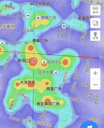 热力图有什么用?它非常方便你观察一个地方的人口密集数量,可以知道一些地方的人员多少,实时的人流量情况。对你出行,特别是在节假日,很多朋友外出游玩,想知道要去的地方人多不多,是否拥挤,热力图就是利器!它可以帮助我们躲避拥挤的地方,使我们旅行更加轻松愉快。你看南京新街口5月4日下午够拥挤的吧,青年节的下午年轻人放假去新街口逛逛的人还是不少哇!