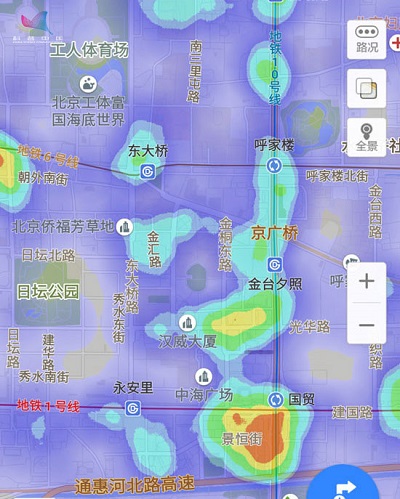 有人要问:“在哪里能看到热力图呢?”答案很简单啊,热力图就在你的手机上!很多朋友手机上都安装有地图APP,有的地图可以提供热力图服务。什么是热力图?它是利用获取的手机数据,定位该区域的用户数量,通过用户数量渲染地图颜色,实现实时展示该地区人的密度,这就是热力图。热力图其实就是手机数量的分布图,当然代表那个时刻的该地区的人流,所以热力图也叫“人口热力图”。