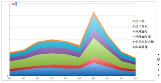 根据热力图的数据还可以计算出2014年12月31日18时到2015年1月1日凌晨3时外滩的人流情况(图4)。我们可以看出在踩踏事件发生的时刻汉口路人员的数量激增。如果城市管理人员及时掌握热力图,采取措施及时疏导,就可能会避免踩踏事故的惨剧(图4)。