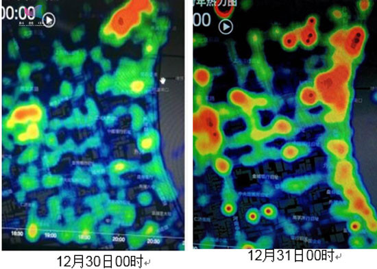 热力图是大数据应用的结果,人口热力图除了为公众出行服务以外,更大的用途就是助力智慧城市建设,助力城市减灾和城市安全。回顾一下2014年12月30-31日晚上外滩的热力图(图3)。对比30日和31日热力图,明显看出12月31日晚上外滩地区流动人口已经异常密集。如果管理者能够充分利用手机上12月31的热力图,就可能避免惨剧的发生。