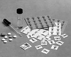 LSD有效致幻剂量为25微克,作为迷幻剂的常规剂量为100-200微克,因此常将药物滴加在抽象艺术和动画图片、邮票和纹身纸片上含服或舌下给药。LSD通常半小时显效,可持续12小时。