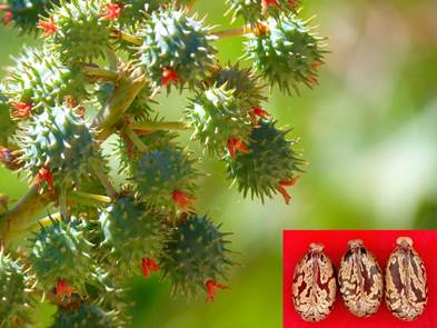 蓖麻的种子——蓖麻籽的含油量为40%至60%,是蓖麻油的来源,具有广泛的用途。蓖麻籽中有一种低浓度的水溶性毒素,蓖麻毒素。